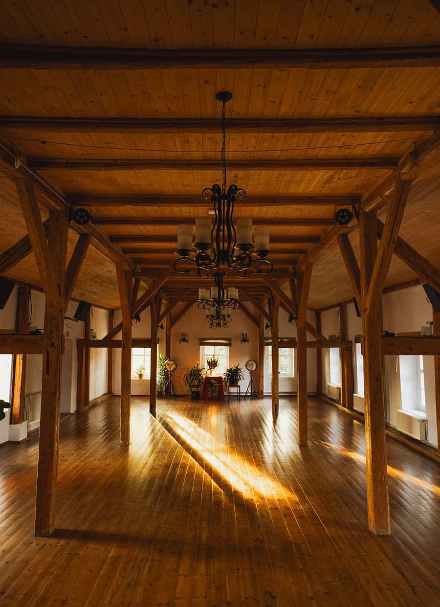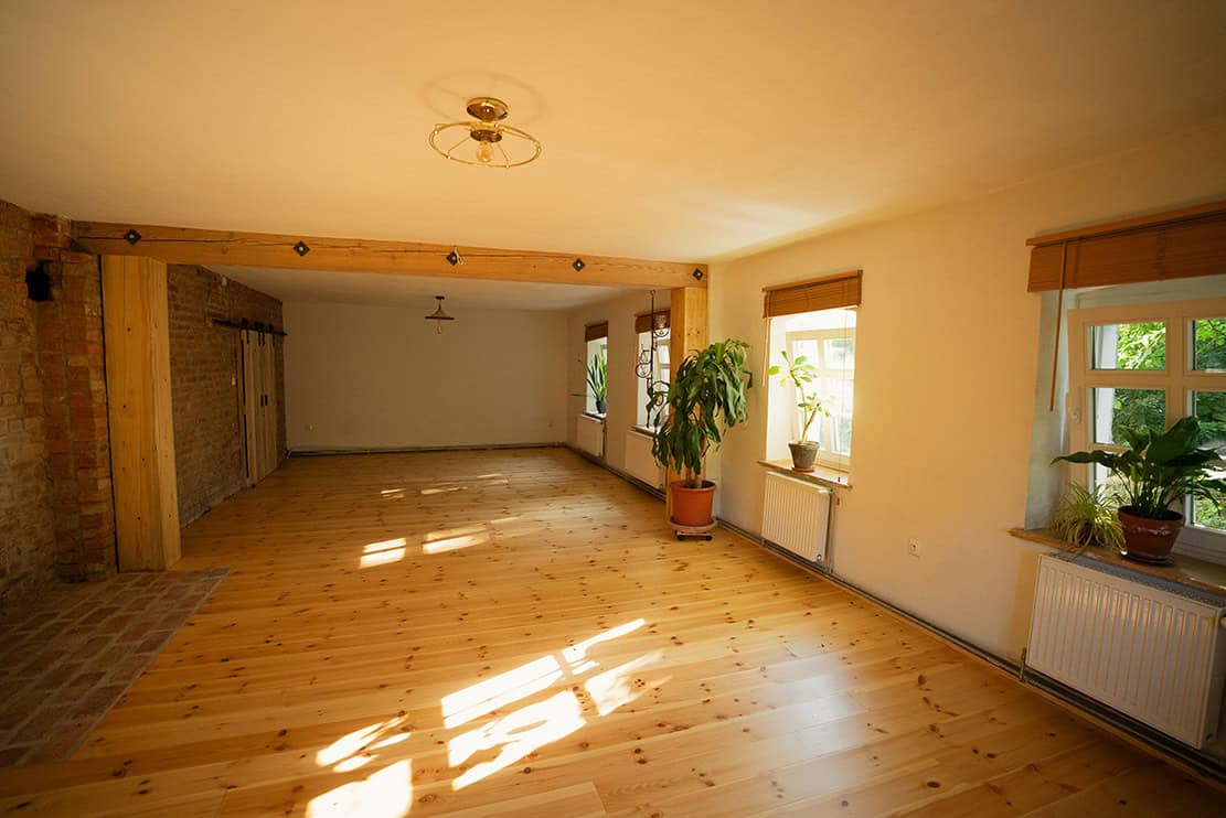 W domku obok Biorezydencji stworzyliśmy nową, kameralną przestrzeń warsztatową. To jasna sala z drewnianą podłogą o powierzchni 50 m². W zależności od potrzeb możemy wyposażyć ją w materace i poduszki do medytacji, tworząc warunki zarówno do pracy z ciałem, jak i do spokojnych praktyk czy spotkań w kręgu. Sala jest dobrze doświetlona naturalnym światłem, a przestrzeń można dowolnie aranżować w zależności od rodzaju zajęć. Istnieje również możliwość podłączenia nagłośnienia i rzutnika, co sprawia, że przestrzeń jest wszechstronna i komfortowa dla różnorodnych warsztatów.